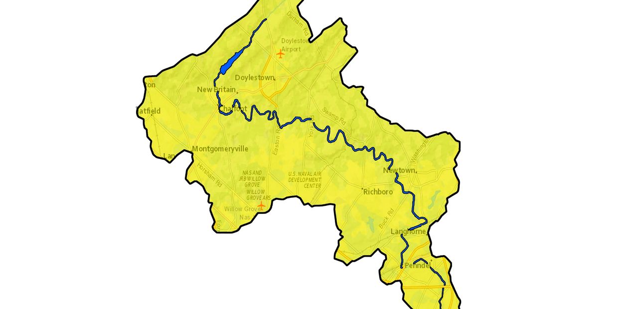 The watershed covers a large part of Bucks county and a small part of Montgomery County. It includes the Neshaminy Creek, which is a 40.7 mile stream running through Bucks county, the Little Neshaminy Creek, which is a tributary of the Neshaminy Creek, Newtown Creek, Cooks Run and 3 tributaries that are all named Mill Creek. It covers an area of approximately 236 square miles. The name Neshaminy derives from the Lenape Indian tribe, meaning 'the place where we drink twice'. It is part of the Delaware River basin and runs through several parks in Bucks and Montgomery counties before it empties through Neshaminy State Park in Bensalem into the Delaware River.