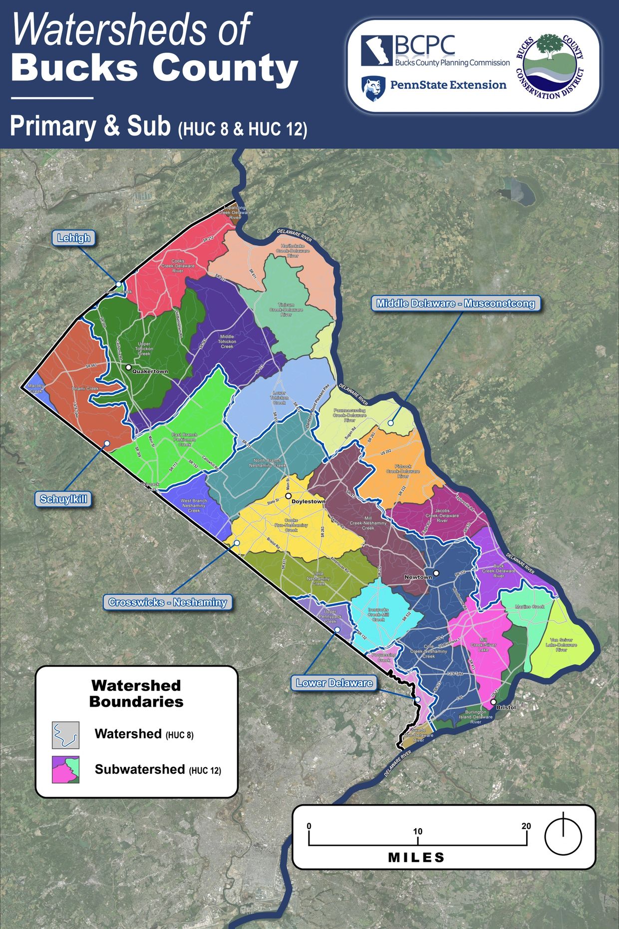This map shows the primary watersheds and subwatersheds of Bucks County. Watershed boundaries are delineated on the map with a thick blue line. Each primary watershed is also composed of smaller “subwatersheds,” which are shown on the map in various color fills.